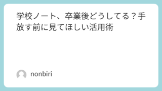 生活 学校ノート、卒業後どうしてる?手放す前に見てほしい活用術 学生生活で毎日のように使ってきた学校ノート。授業の内容や大切な思い出が詰まったそのノートは、卒業後に手元に残っている方も多いのではないでしょうか。しかし、年月が経つと「これを取っておくべき?それとも処分?」と悩むこともありますよね。きれいに... 生活